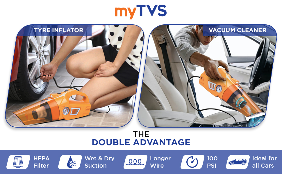 myTVS Car 2 in 1 Vacuum Cleaner + Tyre Inflator | 100 Psi, 12V DC |Portable Tyre Inflator for Car & Bike with LED Torch | Compatible with All Cars with 1+1 Years Warranty